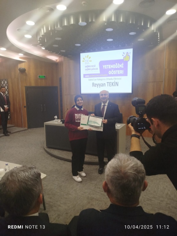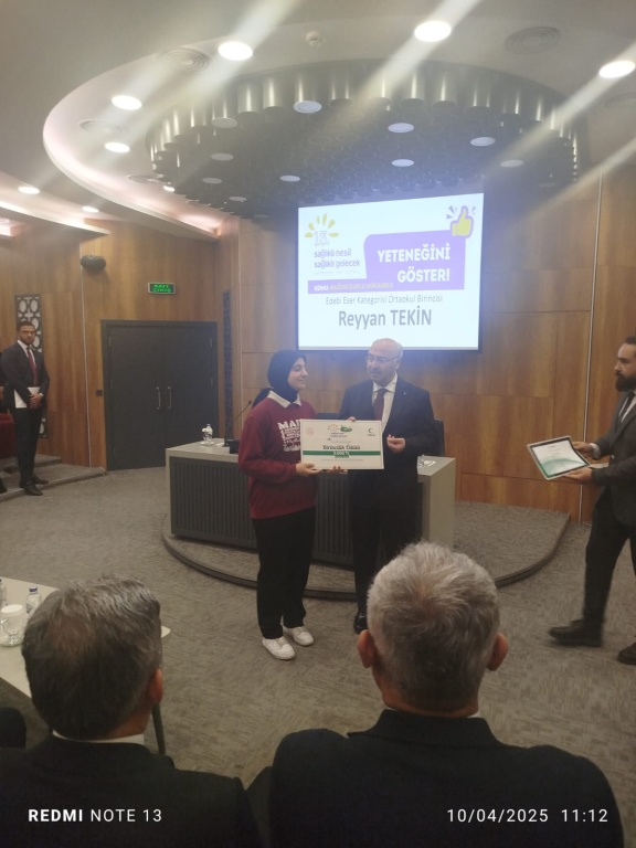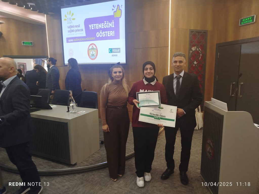 Öğrencimiz Reyyan TEKİN (7/N Sınıfında) Yeşilay Sağlıklı Nesil Sağlıklı Gelecek Yarışması Bağımlılıkla Mücadele Edebi Eser(şiir) Kategorisinde Adana birincisi olmuştur. Kendisini tebrik ediyoruz.
